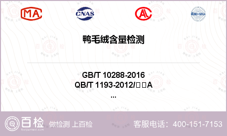 百檢網(wǎng)匯集眾多CNAS、CMA、CAL等資質(zhì)的檢測機構(gòu)遍布全國,可為您提供鴨毛絨含量測試服務(wù),實驗室就近分配。具體請咨詢在線客服。