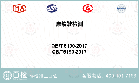 百檢網(wǎng)匯集眾多CNAS、CMA、CAL等資質(zhì)的檢測(cè)機(jī)構(gòu)遍布全國,可為您提供麻編鞋測(cè)試服務(wù),實(shí)驗(yàn)室就近分配。具體請(qǐng)咨詢?cè)诰€客服。