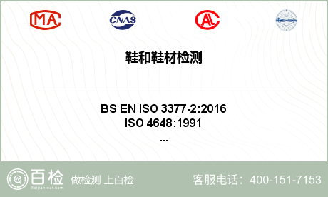 溫馨提示:以上關(guān)于《鞋和鞋材檢測》內(nèi)容僅為部分列舉供參考使用,百檢網(wǎng)匯集眾多CNAS、CMA、CAL等資質(zhì)的檢測機構(gòu)遍布全國,更多檢測需求請咨詢客服。